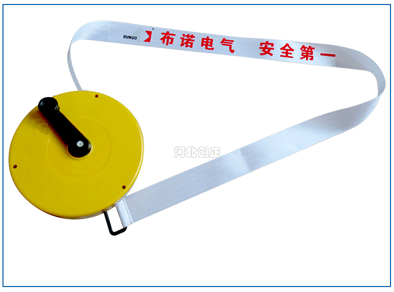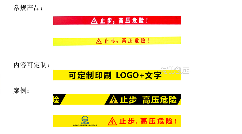 警示帶盒是ABS材料制成;帶是錦綸材質,上面印有“閃電符號,止步,高壓危險”等字樣。